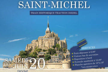 Samedi 20 juin 2026 nous vous proposons une sortie en train rétro en direction du Mont St Michel. Arrivée du rail à Granville et transfert par car au Mont St Michel compris dans le prix du billet. Bientôt ouverture des réservations. Vous pouvez télécharger cette affiche au format A4 en